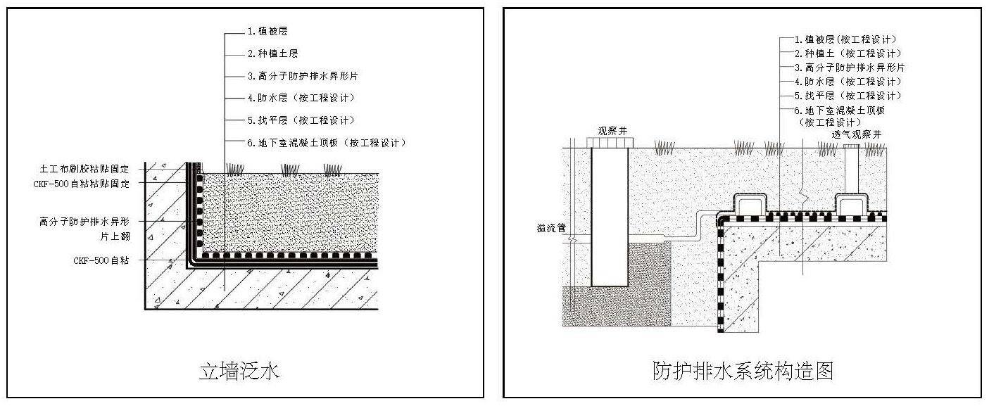 1、按圖紙鋪設(shè)虹吸排水槽,采用CKF500自粘卷材粘接于防水層上。