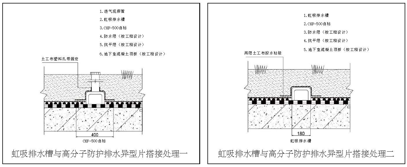 2、鋪設(shè)復(fù)合高分子異型片,拼接部位采用CKF500自粘卷材粘接,復(fù)合層無紡布采用粘接劑粘接固定。