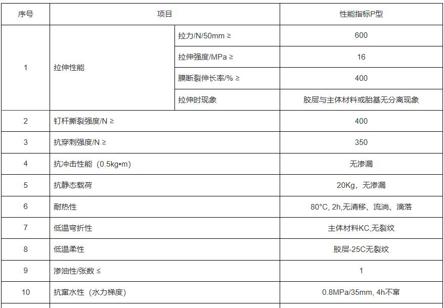 2.1材料性能: 產品執行GB/T 23457-2017《預鋪防水卷材》國家標準中P類要求(表2-1)。