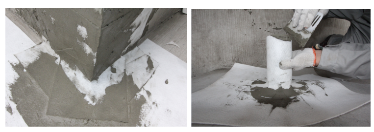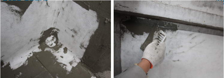 五、施工工藝 濕鋪法: 清理基面→濕潤基層(如基層濕潤無需此項工序)→定位、彈線→攪拌并鋪抹水泥漿-→節點部位加強處理→鋪貼防水卷材→提漿、排氣、晾放→搭接邊密封→卷材收頭、密封→檢查驗收 施工要點: 1、基層清理: 1.1基層表面已清理干凈,并基本平整,無明顯突出部位 1.2施工時基面必須濕潤但不得有明水, 1.3各種管道、預埋構、配件已安裝完畢,固定牢固 2、定位、彈線:在基層面排尺彈線,作為掌握鋪貼的標準線,使其鋪設平直; 3、膠粘劑的制作配備 3.1大面:按水:水泥:專用膠粉=0.6:1:0.004的重量比配制水泥膠粘劑。立面:按水:水泥:專用膠粉=0.4:1:0.004的重量比配制水泥膠粘劑。 按比例準備好足量的水、膠粉、水泥,將膠粉緩慢加入水中,邊加邊攪拌,使膠粉均勻分散在水中。待膠粉分散均勻后,加入水泥,邊加邊攪拌,待攪拌均勻后方可使用。 3.2水泥浸泡到不連續出現氣泡后(15-20min),再開始攪拌至均勻。 3.3水泥膠粘劑稠度具有流動性即可使用。 3.4攪拌好的水泥漿料應在3-4h內用完。 4、鋪貼卷材 4.1鋪貼時,采用趕漿法進行施工,先將成卷的卷材放在需要鋪貼的起始部位,然后沿鋪設方向涂刷水泥粘結膠漿,并將卷材展開沿彈好的標準線向另一端鋪貼,操作時,卷材不要拉太緊,并注意方向沿標準線進行,以保證卷材搭接寬度,同時用滾子壓實、壓平,中間不得有氣泡,以保證卷材與基層的粘結強度; 4.2鋪設下一幅卷材時,一定要注意與上一幅卷材搭接,搭接寬度不低于100mm,并注意粘結膠漿應在卷材邊全部擠壓出漿; 4.3卷材不得在陰陽角接頭,接頭處應間隔錯開; 4.4操作中排氣:每鋪完一張卷材,應立即用干凈的滾刷從卷材的一端開始橫向用力滾壓一遍,以便空氣排出。 4.5搭接邊及卷材收頭用稠漿密封嚴實。 5、細部節點處理 1、陽角、陰角: 1.1將陽角、陰角部位浮漿、雜物鏟除,清理干凈后,若基面干燥時散水濕潤,掃除明水。 1.2陽角、陰角用水泥砂漿或防水砂漿抹成圓弧,圓弧半徑不小于50mm。 1.3裁剪一條寬500mm的卷材作為陽角或陰角附加防水層,然后涂刷水泥膠粘劑鋪設。 1.4陽角、陰角交接處附加層卷材在中心位置向一邊方向裁開,在方形卷材底部中間處劃一刀到卷材中心點,使得卷材下沿叉開,然后涂刷水泥膠粘劑鋪設。 1.5再裁剪一塊(略成扇形)卷材,涂刷水泥膠粘劑后鋪設在開叉處的上面,將露出部位全部遮蓋。 2、管根部位: 2.1清理管根部位四周基面及管道壁,鐵管進行除銹打磨,PVC管表面用鋼絲刷打磨粗糙,基面若基面干燥時散水濕潤,掃除明水。 2.2在管根部涂刷水泥膠粘劑,立面250mm高,平面超出洞口250mm寬。 2.3根據管道外徑剪一塊方形卷材,尺寸比管根半徑長250mm,沿著卷材中心,劃開呈十字狀或米字狀的缺口,將劃開的卷材套入管道用滿粘法將卷材鋪設。 2.4根據管道外徑裁剪一條長度大于管徑100mm,寬度不小于250mm的卷材,將其下端裁成鋸齒狀。將卷材套在管子的外面,然后用滿鋪法將卷材緊密粘貼在管道外壁,上下層接縫粘結時應上下錯開,平整嚴密,管道上端卷材用金屬箍或用鐵絲扎牢。