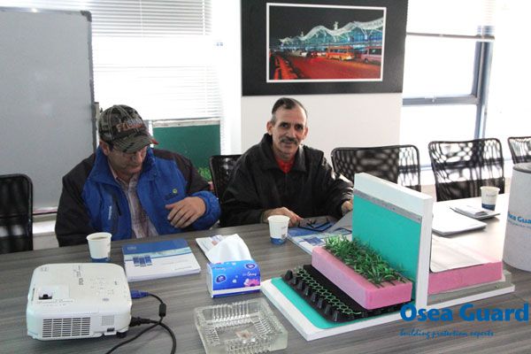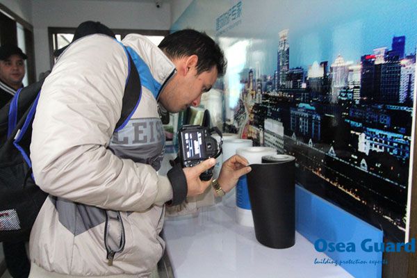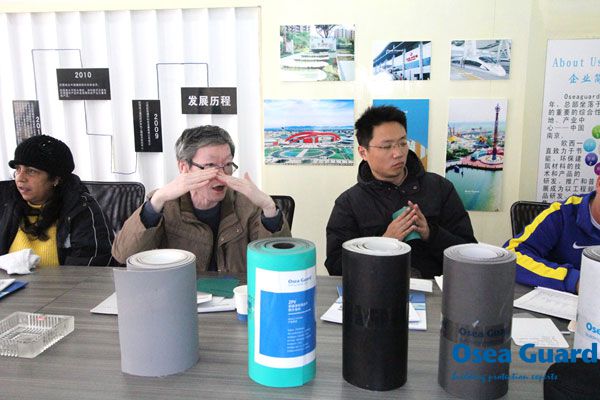 上午八點,吳濤主任一行首先參觀考察了歐西建科現(xiàn)在施工工地——句容北部新城項目,在現(xiàn)場項目經(jīng)理的帶領下,留學生深入了解了項目現(xiàn)場防水材料施工方法和步驟,實地體驗了施工工具使用。