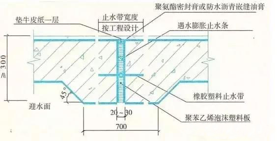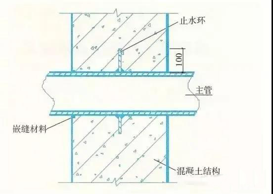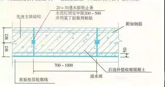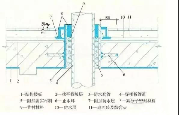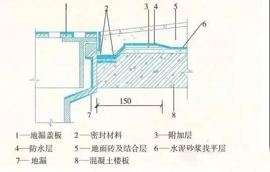 1、防水混凝土應連續澆筑,需要留設施工縫時,墻體水平施工縫應留在高出底板表面不小于300mm的墻體上;拱(板)墻結合的水平施工縫宜留在拱(板)墻接縫線以下150mm~300mm處;墻體有預留孔洞時,施工縫距孔洞邊緣不宜小于300mm。垂直施工縫應避開地下水和裂隙水較多的地段,并宜與變形縫相結合。 2、水平施工縫澆筑混凝土前,應將其表面浮漿和雜物清除,然后鋪設凈漿或涂刷混凝土界面處理劑、水泥基滲透結晶性防水涂料等材料,再鋪30~50mm厚1:1水泥砂漿,并及時澆灌混凝土。 3、垂直施工縫澆灌混凝土前,應將其表面清理干凈,再涂刷混凝土界面處理劑或水泥基滲透結晶型防水涂料,并及時澆灌混凝土。 4、施工縫采用遇水膨脹止水條時,應將止水條嵌固在縫表面預留槽內。所選止水條應具緩脹性能,其7d的凈膨脹率不宜大于Z終膨脹率的60%。 5、施工縫采用中埋止水帶時,應確保止水帶位置準確、固定牢固。 二、變形縫防水施工 中埋式止水帶變形縫 專用止水帶鋼筋套 4、采用遇水膨脹止水條時,應將止水條嵌固在縫表面預留槽內。所選止水條應具緩脹性能,其7d的膨脹率不宜大于Z終膨脹率的60%。 三、后澆帶防水施工 1、后澆帶應設在受力和變形較小的部位,間距宜為30m~60m,寬度宜為700~1000mm。后澆帶可做成平直縫,結構主筋不宜在縫中斷開,如必須斷開,則主筋搭接長度應大于45倍主筋直徑,并應按設計要求增加附筋。 后澆帶防水結構 2、后澆帶應在其兩側混凝土齡期達到42d后再施工。高層建筑的后澆帶應按設計規定的時間進行。 3、后澆帶應采用補償收縮混凝土澆筑,其抗滲和抗壓強度等級不低于兩側混凝土。 四、穿墻管道防水施工 1、穿墻管道應在澆筑混凝土前預埋。穿墻管與內墻角、凹凸部位的距離應大于250mm,穿墻管接頭距地面1000mm,部件焊接要求滿焊。翼環應刷防銹漆兩道。 2、結構變形或管道伸縮量較小時,穿墻管可采用主管直接埋入混凝土內的固定式防水法,并應預留凹槽,槽內用嵌縫材料嵌填密實。 固定式穿墻管防水構造 3、結構變形縫或管道伸縮量較大或有更換要求時,應采用套管式防水法,套管應加焊止水環。 穿墻管構造 五、廚衛間防水1、地面防水 (1)廚房、衛生間等有防水要求的房間,其地面面層標高應低于相鄰房間20mm。 (2)廁浴間、廚房的墻體,宜設置高出樓地面150mm以上的現澆混凝土泛水、 (3)廁浴間、廚房四周墻根防水層泛水高度不應小于250mm,其他墻面防水以可能濺到水的范圍為基準向外延伸不應小于250mm。浴室花灑噴淋的臨墻面防水高度不得低于2m。 (4)穿樓板管道應設置止水套管或其他止水措施,套管直徑應比管道大1~2級標準;套管高度應高出裝飾地面20~50mm。套管與管道間用阻燃密實材料填實,上口應留10~20mm凹槽嵌入高分子彈性密實材料。用于熱水管防水處理的防水材料和輔料,應具有相應耐熱性能。 穿墻板管道防水做法 2、地漏設置 (1)找平層施工時應從地漏出水口向四周拉放射線找坡(當地漏靠墻時,其余墻的根部應保證在同一標高上),樓地面向地漏處的排水坡度不宜小于1%,地漏應低于地面面層表面5~8mm。 (2)地漏與地面混凝土間應留置凹槽,用合成高分子密封膠進行密封防水處理。地漏四周應設置加強防水層,加強寬度不應小于150mm。防水層在地漏收頭處,應用合成高分子密封膠進行密封防水處理。 |