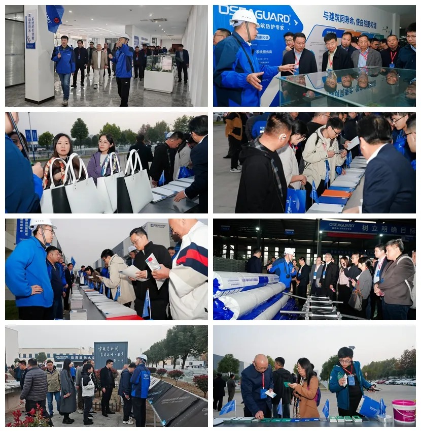 講解人員結合展廳圖文展板與實物樣品,系統介紹了歐西盾從深耕高分子防水領域,到研發全系列防水產品的發展脈絡。嘉賓們隨后走進現代化生產車間,觀摩了自動化生產線,又在產品展示區了解了企業從基礎型卷材到特種場景專用產品的豐富布局與實力。